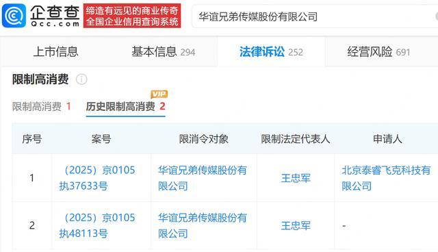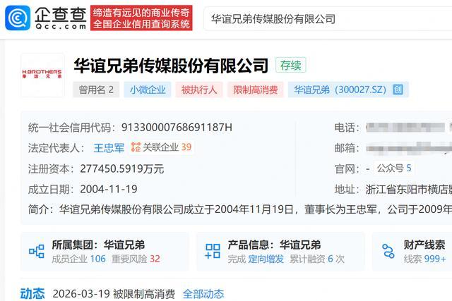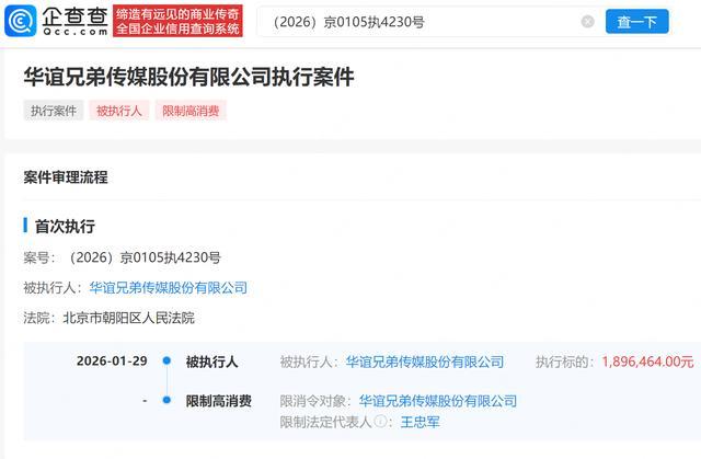企查查APP显示,近日,华谊兄弟(300027.SZ)及法定代表人王忠军新增一则限制消费令,执行法院为北京市朝阳区人民法院,案件流程信息显示,今年1月,该公司已因此案被执行189万余元。